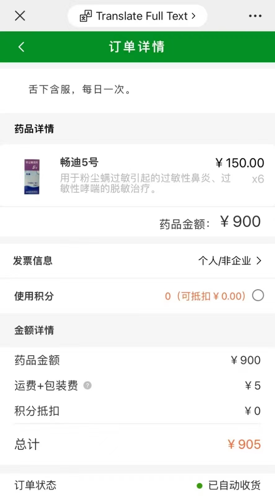 根据该患者提供的购药凭证,粉尘螨滴剂5号产品单价为150元,6瓶共计900元,此外还有5元的“运费+包装费”。