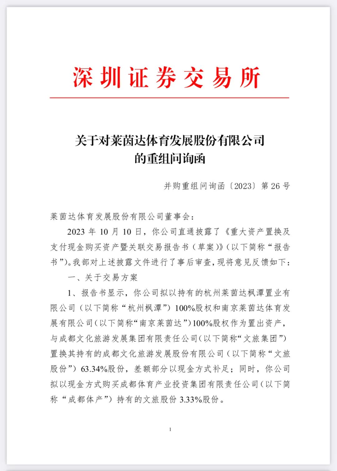 10月19日,深交所发布对莱茵体育重组问询函,就交易方案、交易标的、评估情况及其他事项共10条问询意见,要求莱茵体育10月26日前,将有关说明材料对外披露并报送深交所。