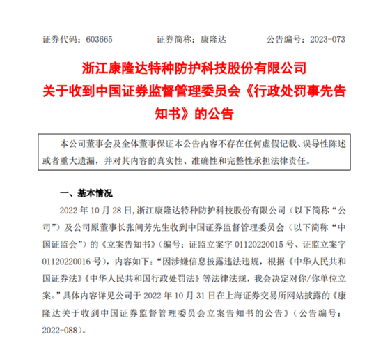 在被立案调查近一年后,康隆达于10月24日收到了中国证监会出具的《行政处罚事先告知书》,因涉专网通信业务、年报存虚假记载等信披违法,公司及实控人、时任董秘均被处罚,拟罚款金额合计700万元。