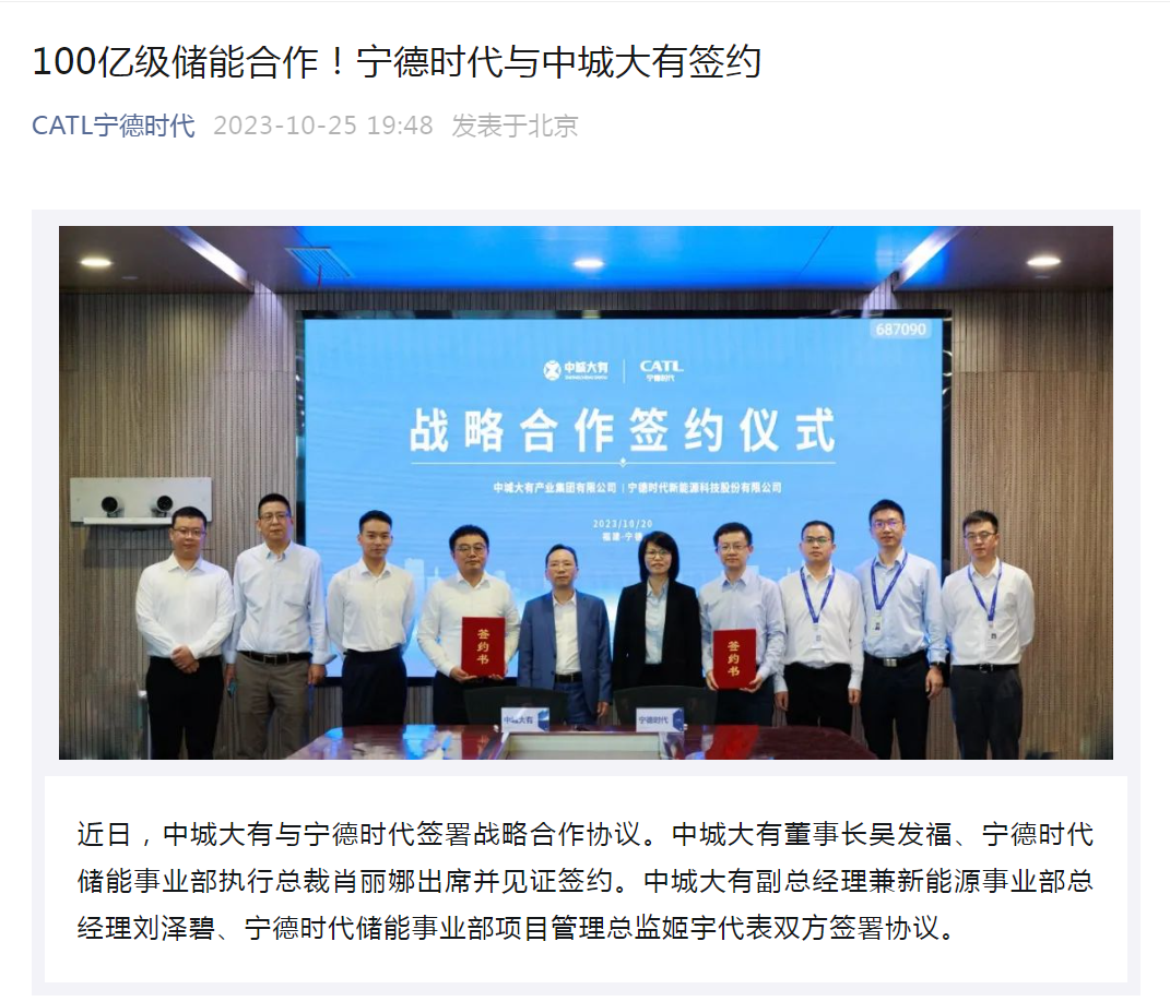10月25日晚间,宁德时代(SZ300750)方面公告,近日,中城大有与宁德时代签署战略合作协议。中城大有董事长吴发福、宁德时代储能事业部执行总裁肖丽娜出席并见证签约。中城大有副总经理兼新能源事业部总经理刘泽碧、宁德时代储能事业部项目管理总监姬宇代表双方签署协议。