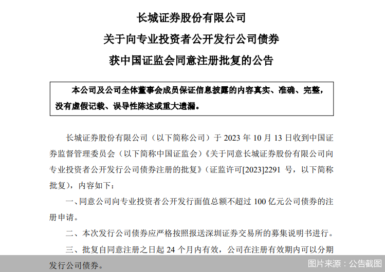 北京商报讯(记者 李海媛)10月15日,长城证券发布公告称,于10月13日收到中国证监会《关于同意长城证券股份有限公司向专业投资者公开发行公司债券注册的批复》,同意长城证券向专业投资者公开发行面值总额不超过100亿元公司债券的注册申请。批复自同意注册之日起24个月内有效,公司在注册有效期内可以分期发行公司债券。