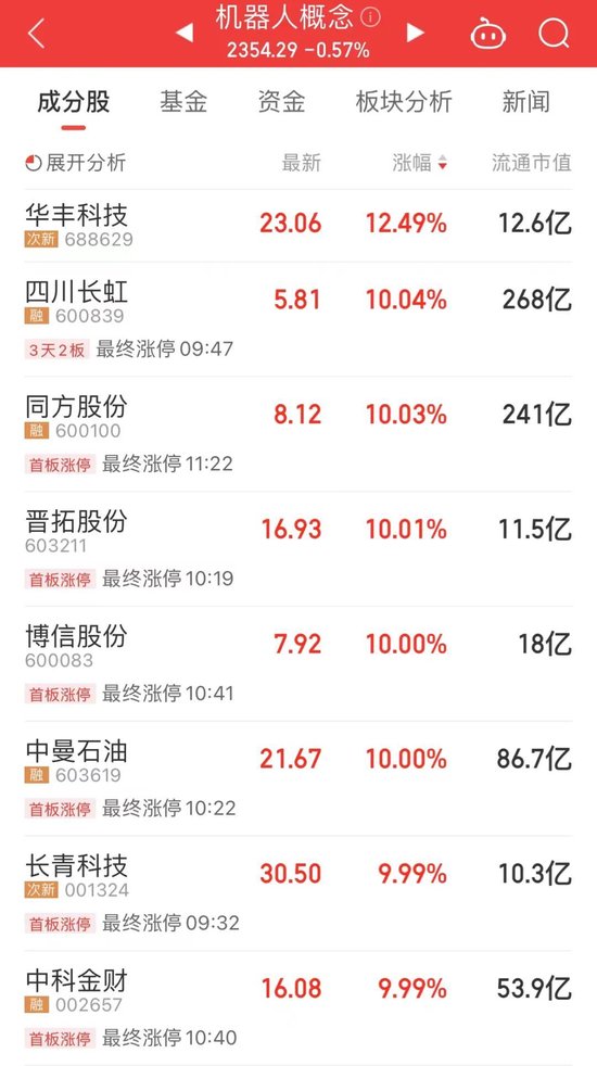 机器人概念早盘异动拉升,长青科技、晋拓股份、四川长虹、中科金财等多只个股涨停,东旭光电、高新兴、华丰科技等纷纷冲高。消息面上,特斯拉官网放出了人形机器人执行器生产主管的招聘。