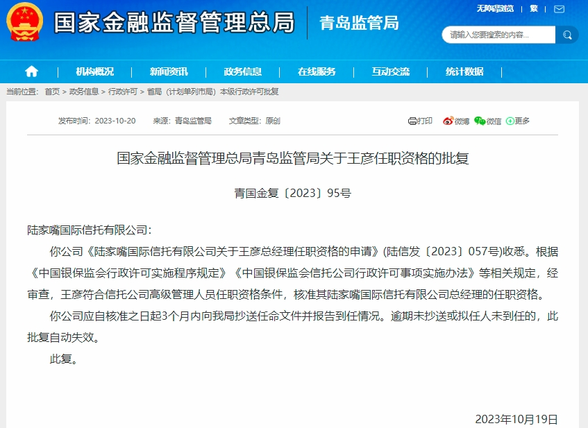10月20日,国家金融监督管理总局青岛监管局发布公告,核准王彦陆家嘴国际信托有限公司总经理的任职资格。值得注意是,今年6月29日,陆家嘴信托官方公众号的文章还显示,陆家嘴信托党委副书记、总经理为崔斌,而王彦为陆家嘴信托党委委员、副总经理。
