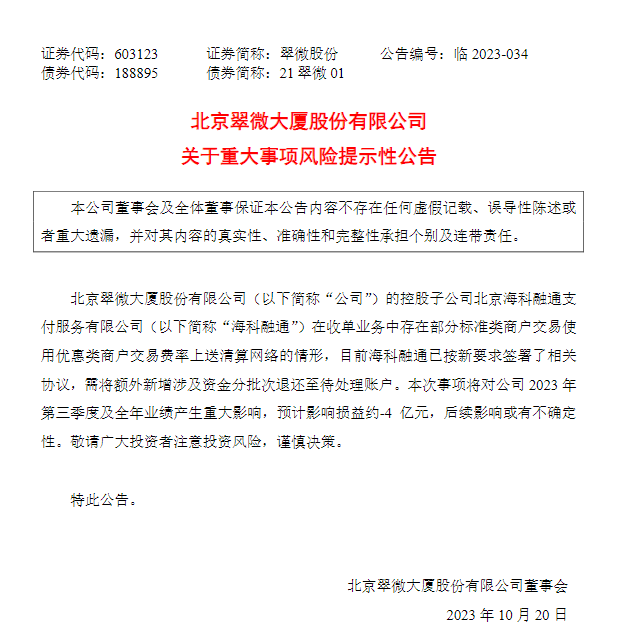 10月19日盘后,翠微股份(603123.SH)发布《关于重大事项风险提示性公告》,称控股子公司海科融通在收单业务中存在部分标准类商户交易使用优惠类商户交易费率上送清算网络的情形。本次事项将对公司2023年第三季度及全年业绩产生重大影响,预计影响损益约-4亿元。