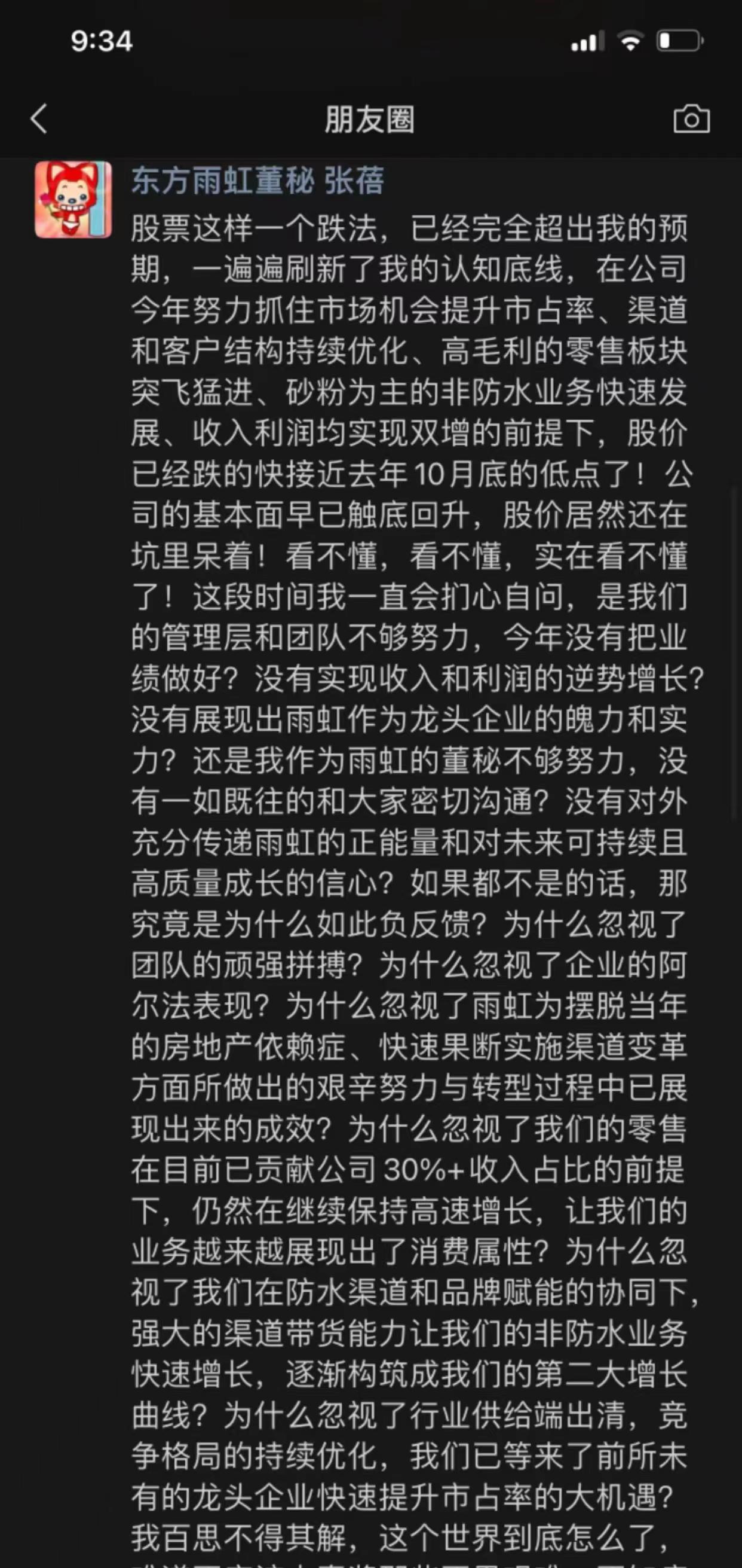 基本面早已回升股价还在坑底?东方雨虹董秘朋友圈直呼“看不懂” 同行:于我心有戚戚焉