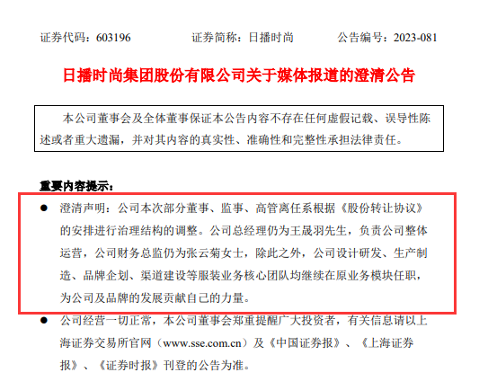 10月16日凌晨,日播时尚再发公告,其声称本次部分董事、监事、高管离任系根据《股份转让协议》的安排进行治理结构的调整。公司总经理仍为王晟羽先生,负责公司整体运营,公司财务总监仍为张云菊女士,除此之外,公司设计研发、生产制 造、品牌企划、渠道建设等服装业务核心团队均继续在原业务模块任职, 为公司及品牌的发展贡献自己的力量。