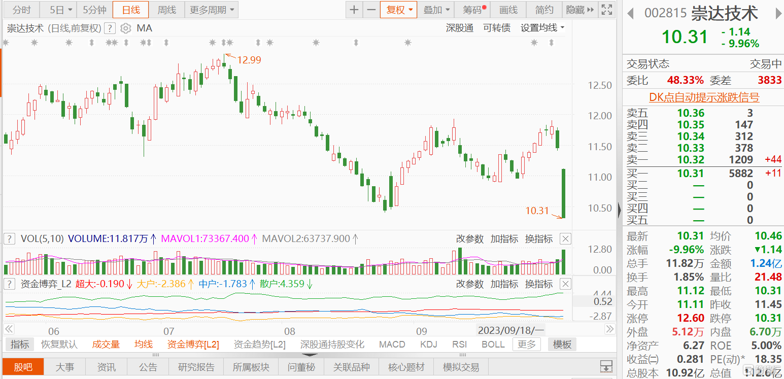 崇达技术(002815.SZ)今日低开低走,现已跌停报10.31元,股价创逾9个月新低,总市值112.6亿元。消息上,崇达技术10月13日公告,解除限售股份的数量为2.02亿股,占公司总股本的18.5793%,本次解除限售股份的上市流通日期为10月17日。