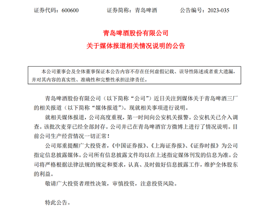 10月23日早间,青岛啤酒发布声明公告称,近日关注到媒体关于青岛啤酒三厂的相关报道。就相关媒体报道,公司高度重视,第一时间向公安机关报警。公安机关已介入调查。该批次麦芽已经全部封存。公司并已在青岛啤酒官方微博上进行了情况说明。目前生产经营情况一切正常。