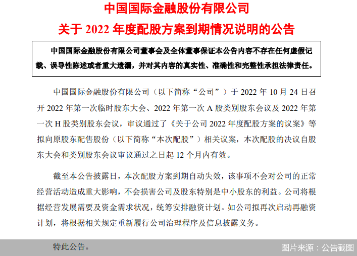 但中金公司也提到,截至此次公告披露日,本次配股方案到期自动失效,该事项不会对公司的正常经营活动造成重大影响,不会损害公司及股东特别是中小股东的利益。公司将根据经营发展需要及资金需求状况,统筹安排融资计划。如公司拟再次启动再融资计划,将根据相关规定重新履行公司治理程序及信息披露义务。