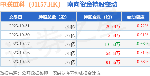 中联重科(01157.HK):10月31日南向资金增持126.78万股