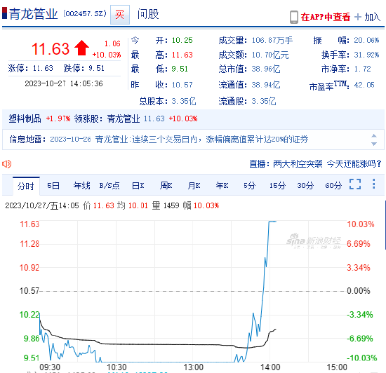 10月27日消息,水利概念股青龙管业涨停上演“地天板”,成交金额超9亿,该股此前2连板,今日早盘一度跌停。