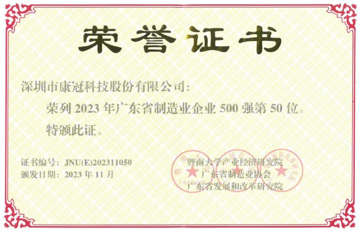 11月21日,2023广东省制造业500强峰会在佛山举行。会上,主办方发布了“2023年广东省制造业企业500强”名单,康冠科技连续多年上榜“广东省制造业企业500强”称号,此次荣获50强。