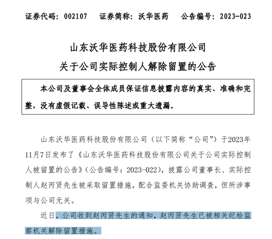 11月22日,沃华医药公告称,近日,公司收到董事长、实际控制人赵丙贤的通知,赵丙贤已被相关纪检监察机关解除留置措施。