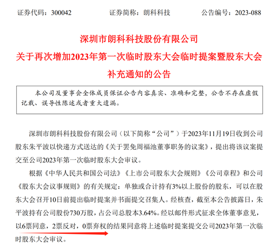 根据计划,朗科科技将于11月29日召开2023年第一次临时股东大会,但是,在股东大会召开前夕,小股东却突然提交罢免董事长周福池的议案,且该提案获得多数董事同意,同意提交股东大会审议。
