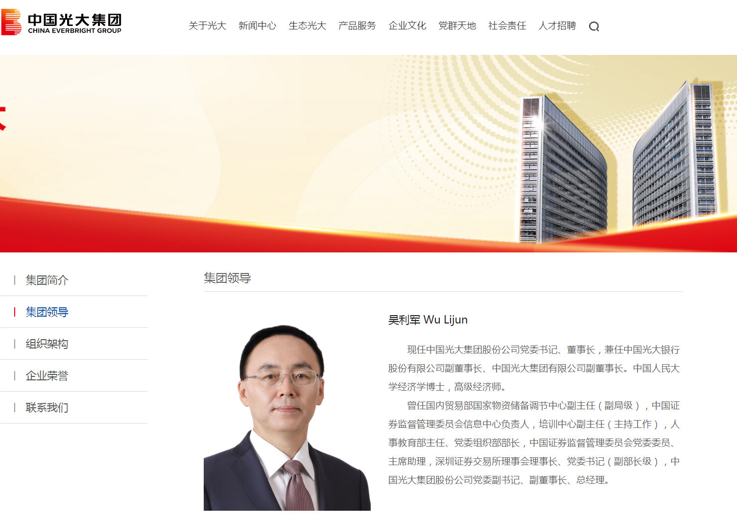 光大集团官网显示,吴利军现任中国光大集团股份公司党委书记、董事长,兼任中国光大银行股份有限公司副董事长、中国光大集团有限公司副董事长。中国人民大学经济学博士,高级经济师。