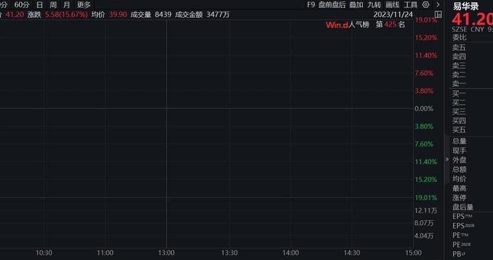 11月24日,易华录开盘涨逾8%,截至发稿,股价涨幅扩大至15%,报41.20元。