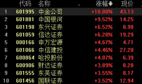 中金公司涨停,中国银河涨超9%,板块内个股全线飘红。