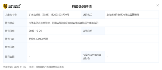 10月26日,上海市浦东新区市场监督管理局下发的沪市监浦处(2023)152023003779号“罚单”载明:因”未按照法律、行政法规规定的期限公示或者报送年度报告“,东吴证券上海自贸试验区分公司(简称:上海自贸区分公司)被罚款3000元。