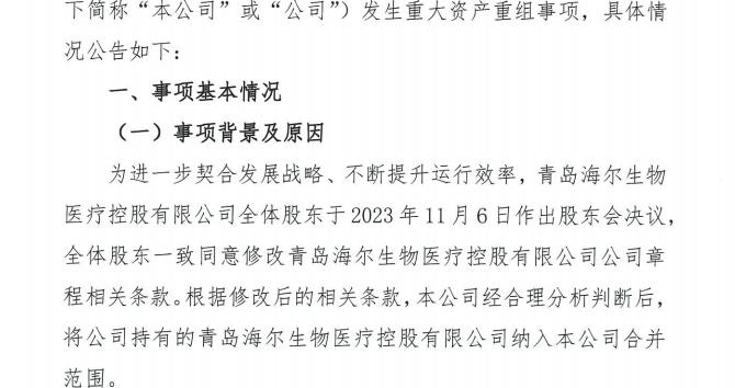 原标题《海尔金控重大资产重组!将海尔生物大股东纳入合并范围》