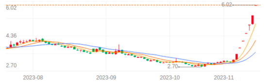 受半导体概念刺激,11月初,皇庭国际走出一波强势行情。11月6日,股价大涨4.75%,11月7日起,更是一路涨停。