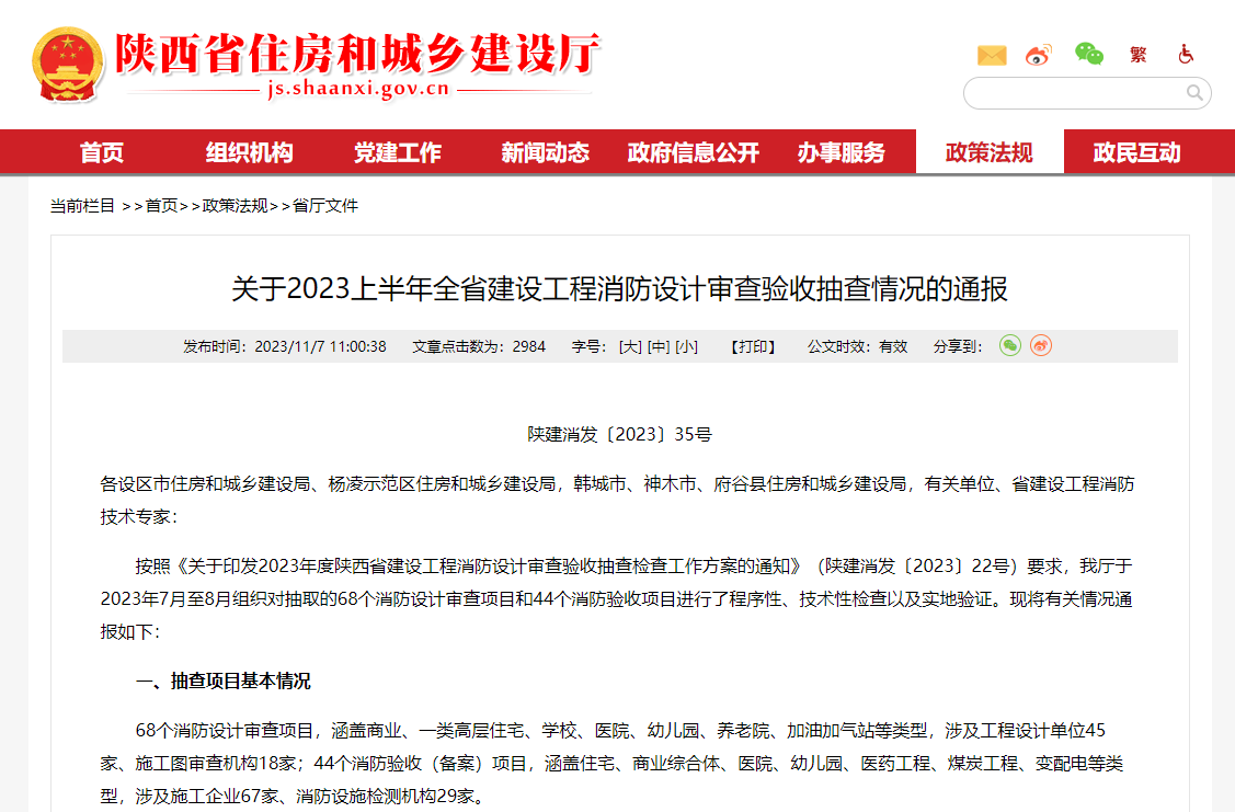 通报显示,陕西省住房和城乡建设厅于2023年7月至8月组织对抽取的68个消防设计审查项目和44个消防验收项目进行了程序性、技术性检查以及实地验证。消防设计抽查共发现程序性问题66条,技术性问题1115条,消防验收抽查共发现程序性问题125条,技术性问题461条,其中违反强制性条文66条,非强制性条文395条。