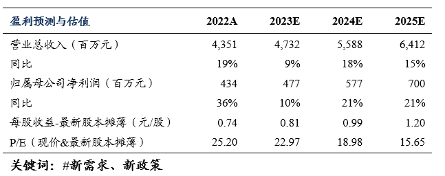 盈利预测与投资评级:我们维持公司2023-2025年归母净利润预测为4.8/5.8/7亿元,当前市值对应PE为23/19/16倍,维持“买入”评级。
