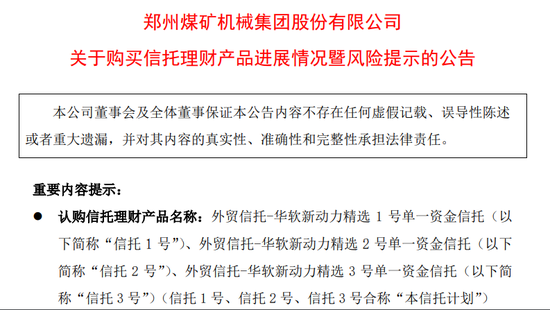 根据郑煤机11月19日的公告,2023年5月29日,公司与外贸信托签订了《外贸信托-华软新动力精选1号单一资金信托信托合同》《外贸信托-华软新动力精选2号单一资金信托信托合同》《外贸信托-华软新动力精选3号单一资金信托信托合同》,公司以自有资金各1亿元认购了上述信托产品,期限均为12个月。