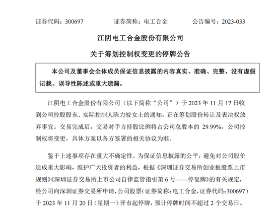 11月19日晚间,电工合金(300697)发布公告称,公司于11月17日收到公司控股股东、实际控制人陈力皎的通知,正在筹划股份转让及表决权放弃事宜,公司控制权将变更。