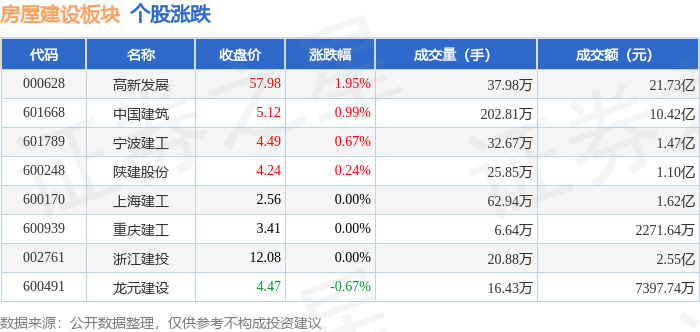 北向资金方面,当日房屋建设板块北向资金持股市值为86.7亿元,增持1.57亿元。其中增持最多的是中国建筑,增持了1.82亿元。减持持最多的是浙江建投,减持了0.18亿元。房屋建设板块北向资金持股变动明细见下表: