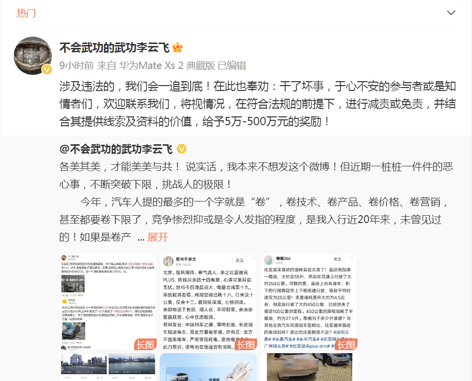 比亚迪公关总经理@不会武功的武功李云飞发文称,“今年,汽车人提的最多的一个字就是“卷”,卷技术、卷产品、卷价格、卷营销,甚至都要卷下限了,竞争惨烈抑或是令人发指的程度,是我入行近20年来,未曾见过的!如果是卷产品卷水平,那是要鼓掌!但要是卷下限,则令人不齿不屑!”