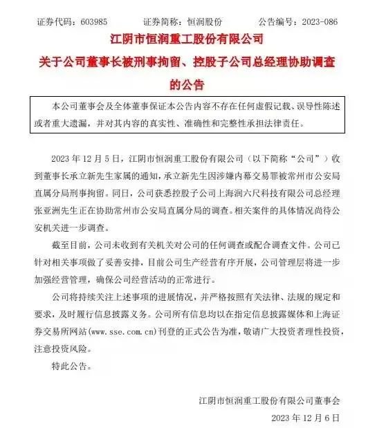 12月5日晚,恒润股份发布公告称,收到董事长承立新先生家属的通知,承立新先生因涉嫌内幕交易罪被常州市公安局直属分局刑事拘留。同日,公司获悉,控股子公司上海润六尺科技有限公司(以下简称“润六尺”)总经理张亚洲先生正在协助常州市公安局直属分局的调查。相关案件的具体情况,尚待公安机关进一步调查。