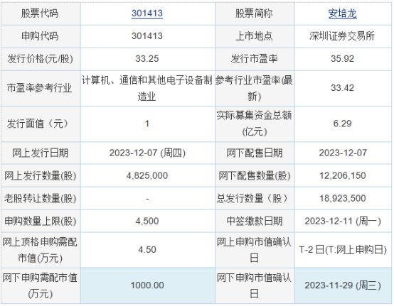 安培龙2023年12月6日披露首次公开发行股票并在创业板上市发行公告,公司本次募投项目预计使用募集资金为49,363.91万元。按本次发行价格33.25元/股计算,公司预计募集资金总额62,920.64万元,扣除发行费用约8,492.71万元(不含增值税)后,预计募集资金净额约为54,427.93万元(如存在尾数差异,为四舍五入造成)。
