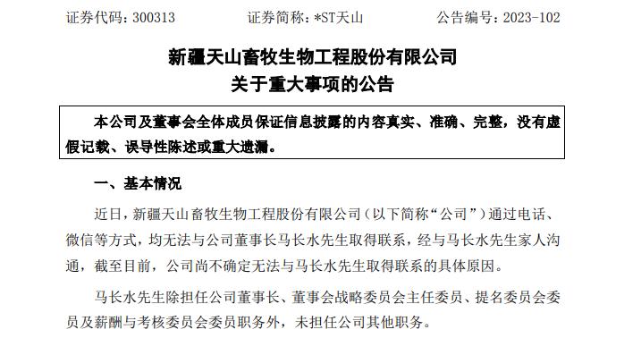 11月29日晚间*ST天山披露公告显示,近日上市公司通过电话、微信等方式,均无法与公司董事长马长水取得联系,经与马长水先生家人沟通,截至目前,公司尚不确定无法与马长水取得联系的具体原因。