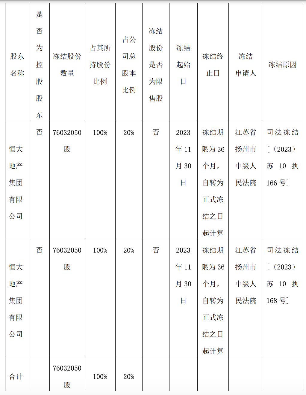 廊坊发展称,2023年11月30日,公司收到中国证券登记结算有限责任公司上海分公司《股权司法冻结及司法划转通知》(2023司冻1130-1号)、《江苏省扬州市中级人民法院协助执行通知书》[(2023)苏10执166号]、《江苏省扬州市中级人民法院协助执行通知书》[(2023)苏10执168号],关于中国农业银行股份有限公司仪征市支行与恒大地产集团有限公司案、中国农业银行股份有限公司扬州润扬支行与恒大地产集团有限公司案两起案件,江苏省扬州市中级人民法院作出的执行裁定书已经发生法律效力,恒大地产持有的公司76032050股股份被轮候冻结,具体如下: