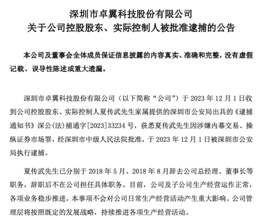 对于夏传武被捕,卓翼科技在12月1日晚公告中表示,目前公司及子公司生产经营运作正常,各项业务稳步推进,该事项不会对公司日常生产经营活动产生重大影响。公司管理层将按照既定的发展战略,持续推进各项生产经营活动。