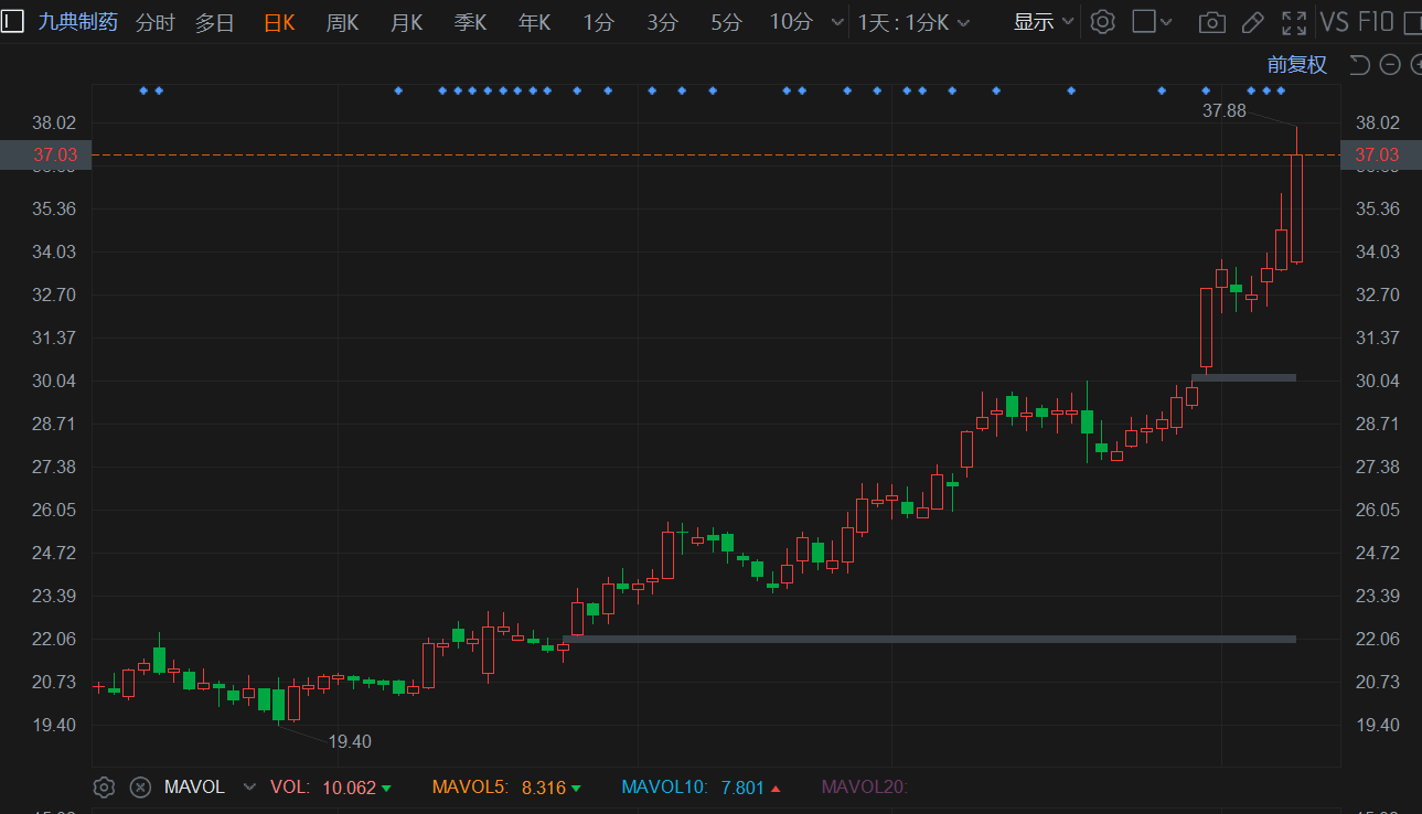 九典制药(300705.SZ)延续强势上涨行情,现涨超7%,年内累计升幅达55%,报37.88元续刷历史新高,总市值128亿元。消息上,近日公司取得椒七麝凝胶贴膏III期临床试验总结报告。华鑫证券研报称,椒七麝凝胶贴膏临床效果显著、安全性较好,经皮给药平台稳固强化。维持“买入”投资评级。