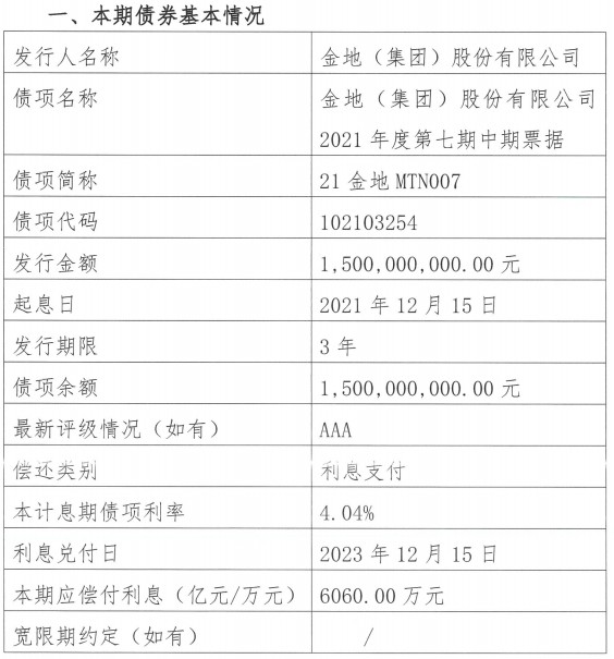 金地集团(600383.SH):“21金地MTN007”本期应偿付利息6060万元,兑付日为12月15日