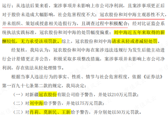 10月9日,证监会决定减轻处罚,其中一项理由是刘中海主观恶性不大,薪酬偏低,100万罚款减少至75万,同时对冠农股份的罚款由300万减少至210万,其他人员不变,各50万,共计435万元。