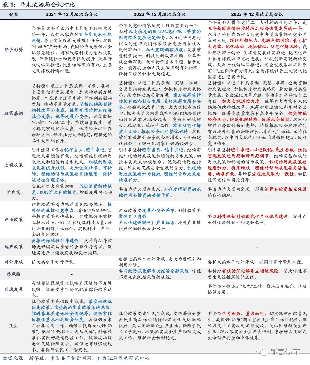 第一,2023年经济总结:向好回升。今年7月政治局会议明确“经济恢复是一个波浪式发展、曲折式前进的过程”,本次会议指出通过扩大内需、优化结构、提振信心,实现了全年经济回升向好。会议总结,2023年是“三年新冠疫情防控转段后经济恢复发展的一年”,指出“我国经济回升向好,高质量发展扎实推进……”。