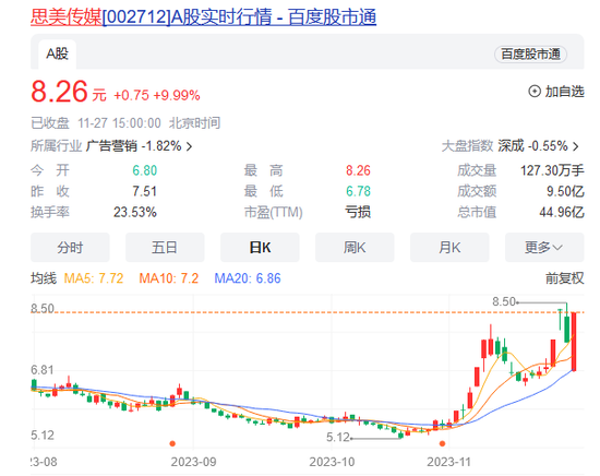 思美传媒10月底披露的三季度报告显示,公司前三季度实现营业收入41.38亿元,同比增长33.74%;归属于上市公司股东的净利润为亏损428.76万元;其中第三季度亏损1435.81万元。