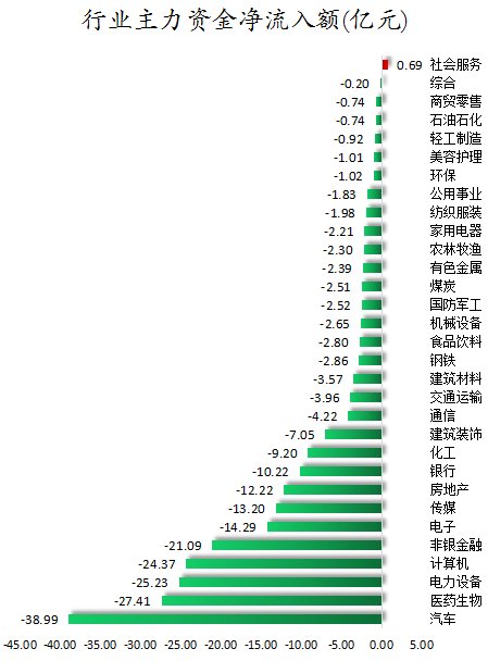 从行业板块来看,申万所属的31个一级行业,今日仅有社会服务1个行业板块主力资金呈现净流入,净流入金额为0.69亿元。30个行业板块主力资金呈现净流出,其中,汽车行业板块主力资金净流出最多,净流出金额为38.99亿元;行业板块主力资金净流出靠前的还有医药生物、电力设备、计算机、非银金融、电子、传媒,净流出金额分别为27.41亿元、25.23亿元、24.37亿元、21.09亿元、14.29亿元、13.2亿元。