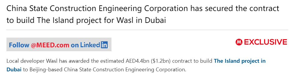 该项目名为The Island项目,于2020年就开始招标,参与投标的企业包括来自阿联酋本土的建筑商Alec、阿联酋阿拉伯建筑公司以及比利时 Bel Hasa Six Construct、中建集团等海外建筑企业。