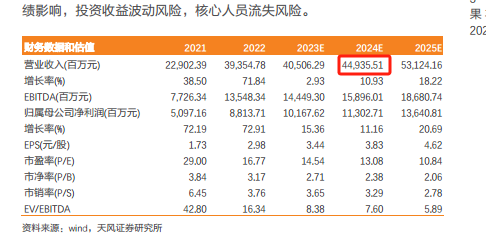然而这与机构预期相差不小,天风证券此前2月预测其2024年营收为449.35亿元。