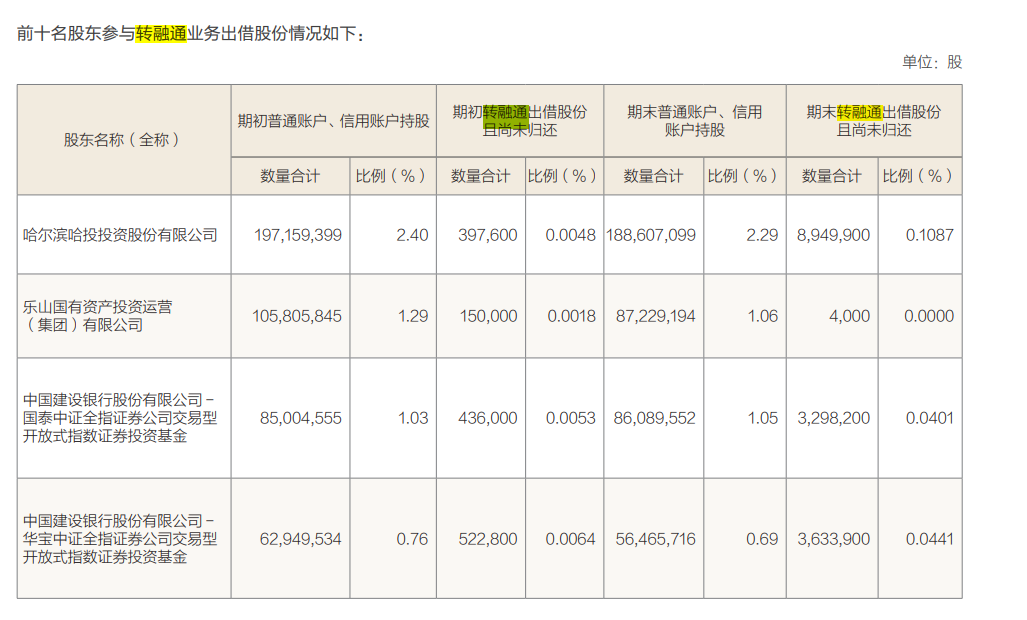 其中,第五大股东哈投股份在2023年初通过转融通出借股份且尚未归还的数量为39.76万股,到期末通过转融通出借股份且尚未归还股份数量增加至894.99万股。哈投股份还减持了公司股份855.23万股。