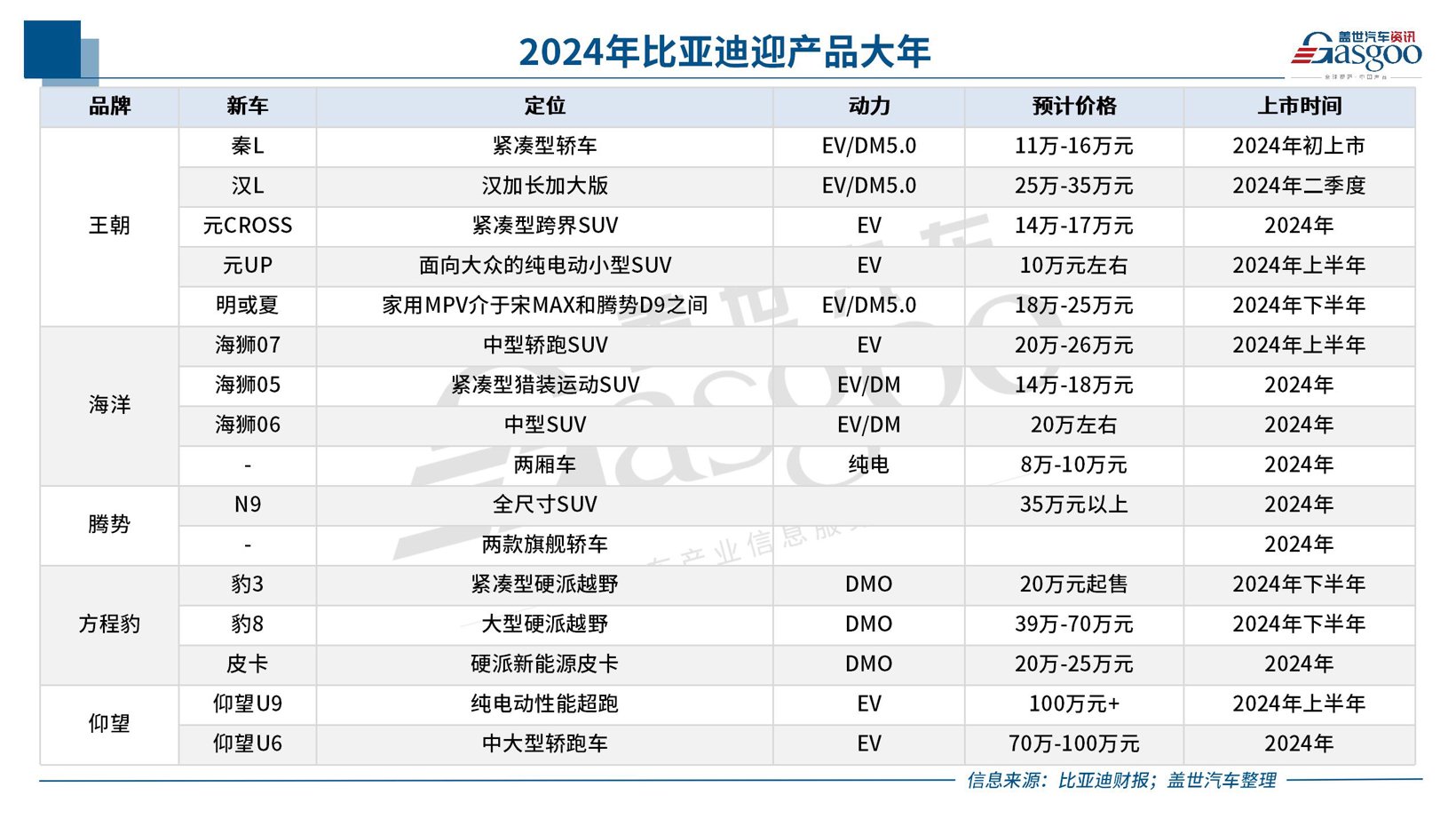 2024年,比亚迪将延续其强势产品周期,发布十余款新车,其中包括皮卡、房车、轿跑等,基本覆盖乘用车所有细分赛道,是比亚迪的高端产品大年,也是智驾大年。