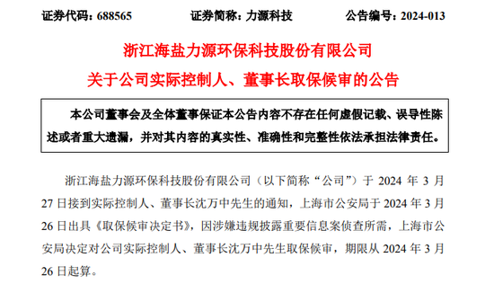 3月27日晚间,力源科技披露公告称,当天接到实际控制人、董事长沈万中的通知,上海市公安局于3月26日出具《取保候审决定书》,因涉嫌违规披露重要信息案侦查所需,上海市公安局决定对公司实际控制人、董事长沈万中取保候审,期限从3月26日起算。