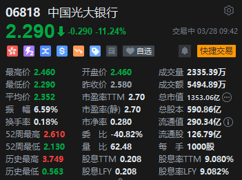 3月28日消息,光大银行早盘跌超11%,报2.29港元,成交额5494.89万港元,总市值1353.06亿港元。