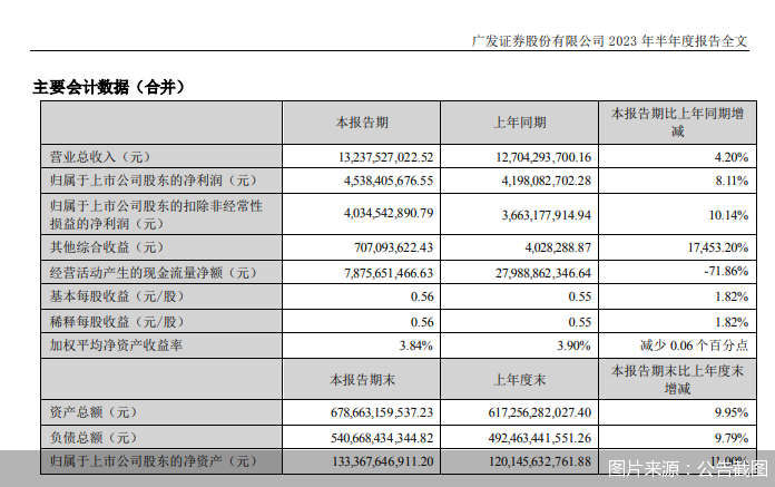 广发证券半年报:归母净利润45.38亿元 同比增长8.11%