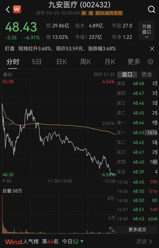 3月25日,九安医疗股价震荡下行,收盘股价跌超6%。