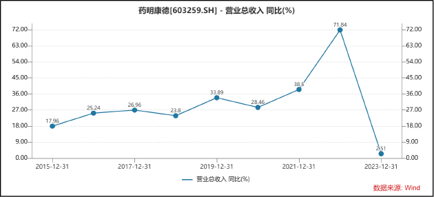 此外,公司2024年的业绩指引也释放出相对消极的预期。据公告显示,药明康德预计2024年收入383亿元至405亿元,相比2023年全年增长-5.06%至0.39%。即使按照乐观预计的405亿元计算,公司营收增速也将创下仅10年以来的新低。